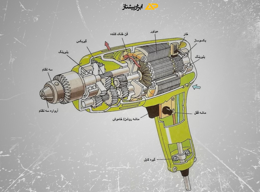 موتور قلب هر دریل است؛ بخش الکتریکی که انرژی را به حرکت چرخشی تبدیل میکند. آرمیچر (روتور) و بالشتکها (بلبرینگها یا نگهدارندهها) بخشهای متحرک موتور را تشکیل میدهند. استفاده از سیمپیچ مسی در موتور مزایایی مانند راندمان بالاتر، هدایت حرارتی بهتر و طول عمر بیشتر را به همراه دارد. در مدلهای حرفهای، موتور قویتر و خنککاری بهتر باعث میشود دستگاه در کارهای طولانیپایدار بماند.